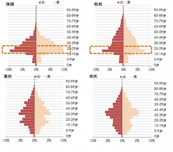 就人口结构来看,“金字塔型”城市年轻人口比例更高,特别是20-29岁这一阶段,这部分群体到今年为止年龄应该处于26-35周岁之间,刚好到了成家立业的黄金年龄,会为该城市的住宅市场提供持续不断的刚性需求。与之相反,“枫叶型”城市在该阶段的人口比例较小,刚性需求不充足,市场持续性将得不到较好的保障。