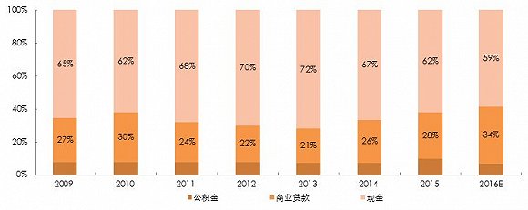 全国住宅销售总金额中贷款占比(2009-2016E)。数据来源:中原集团研究中心根据中国人民银行、住建部相关数据估算