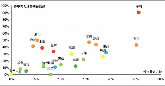 从图形来看,深圳的表现遥遥领先于其他城市。不仅投资占比最高,同时投资客推动房价涨幅也最高。作为过去两年领涨全国的城市,深圳确实吸引了大量的投资客进场。未来深圳楼市下调的风险也明显高于其他城市。由于表现突出,深圳将是未来楼市走向的风向标,建议大家密切关注。