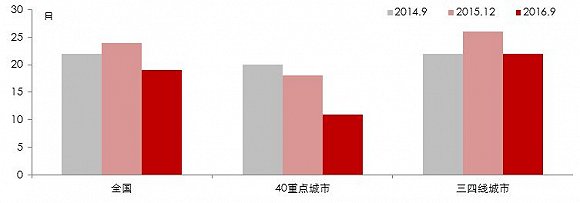 1.从库存消化周期来看,40个重点城市库存消化周期下降非常明显,到2016年9月底,整体已经降至11个月,较2014年水平下降大约一半。其中限购升级的20个城市下降更为明显,目前仅为6个月。可以说去库存任务基本完成。