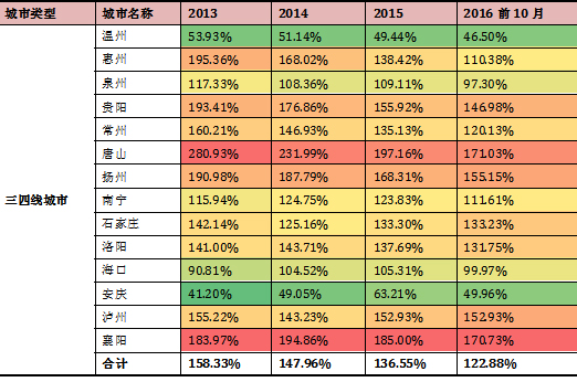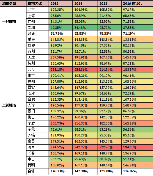 重点城市累计购地供销比情况(2013-2016.10)。数据来源:中原集团研究中心,基期在2009年,部分城市统计范围有所调整,数据与去年年刊会有一定差异。