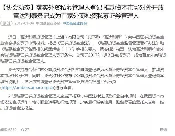 中国证券投资基金协会今日也在网站上公示:我会经过核查,认为富达利泰符合外商独资私募证券投资基金管理人登记条件。公司于2017年1月3日完成登记,成为首家外商独资私募证券投资基金管理人。