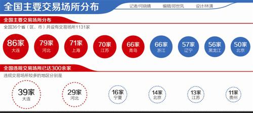 地方交易所摸底调查结果表明,全国36个省(区、市)共设有交易场所1131家。分区域看,交易场所数量超过50家的主要分布在东部,分别为大连86家、河北79家、上海71家、江苏70家、青岛66家、浙江66家、辽宁57家、黑龙江56家、北京50家。