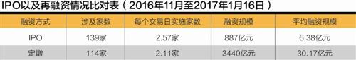Wind数据显示,2016年11月至今的54个交易日里,已有139家新股成功发行,平均每天2.57家,募资总额为887亿元;与此同时,这期间有114家上市公司实施定增,总募资额为3440亿元。