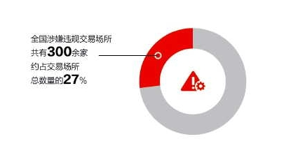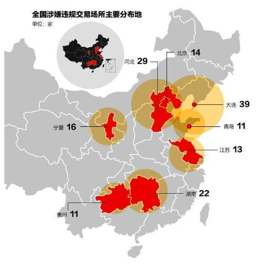 全国共有300多家涉嫌非法期货交易、“类证券”投机交易等违规交易场所,集中在大连、河北、湖南、宁夏、北京、江苏、贵州、青岛等地,多为贵金属、邮币卡、原油交易所。由于摸底调查未能将辖区内交易场所全部纳入现场核查等原因,各类交易场所的实际违规比例可能更高。