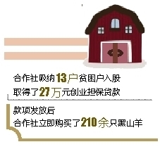 经过合作社与贫困户的双向沟通,合作社吸纳13户贫困户入股,取得了27万元创业担保贷款。款项发放后,合作社立即购买了210余只黑山羊,迈出发展的第一步。