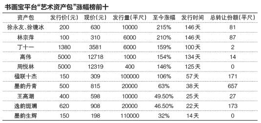 截至2017年1月8日,书画宝平台上已推出的艺术资产包有11个,其中以单个艺术家作品作为一个艺术资产包的有5个,如高伟、丁十一和王高潮资产包等;多个艺术家作品打包作为一个资产包的有6个,如楹联十杰、墨韵生辉等。