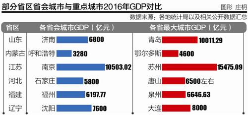 比如,2016年济南GDP约为6800亿元,但是青岛经济总量已经超过万亿。南京经济总量为10503.02亿元,但是苏州有15475.09亿元。