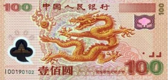 ▲中国人民银行2000年发行的“迎接新世纪”100元塑料纪念钞