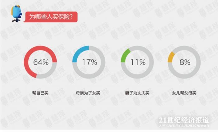 其次,有17%的是母亲为子女买,11%的是妻子为丈夫买,女儿帮父母买保险的则占比8%。为父母买保险的人群正在追赶为丈夫购买保险的占比,越来越多的女儿开始帮父母买保险尽孝,保险产品或将成为对父母尽孝传递温暖的新时尚。