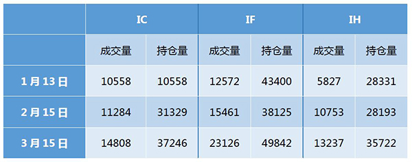 以3月15日的交易数据与一个月前2月15日的数据作比较,IF的成交量增加了整整50%,IC和IH的成交量也分别增加31%和23%。而在持仓量方面,IF、IH和IC在3月15日的总持仓也分别是2月15日时的1.31倍、1.27倍和1.19倍。