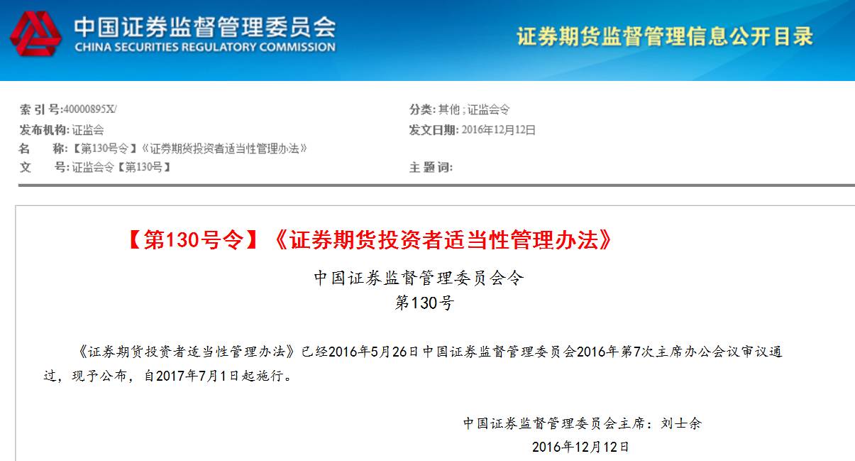 2016年12月,证监会发布《证券期货投资者适当性管理办法》(以下简称《办法》),自2017年7月1日起施行,同时发布《关于实施<证券期货投资者适当性管理办法>的规定》,自发布之日起施行。制定《办法》是落实习近平同志“加快形成融资功能完备,基础制度扎实,市场监管有效,投资者合法权益得到充分保护的股票市场”重要指示精神和国务院有关文件部署,以及“依法监管、从严监管、全面监管”工作要求的重要举措,标志着我国资本市场投资者合法权益保护的基础制度建设又向前迈进了重要一步。