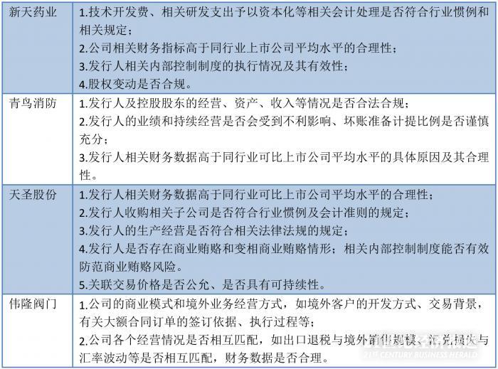 在主板发审委的意见中,都强调了充分揭示风险一词,发审委提出询问的各个方面也是围绕公司可能面临的风险展开,其中公司内控是否合理、公司同业可比情况、财务数据是否与实际情况相匹配,坏账计提是否充分等各个方面成了发审委询问的高频词汇。除此之外,环保问题、是否存在商业贿赂问题也成为发审委关注的问题。