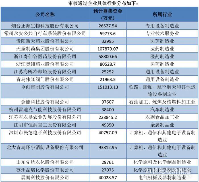 根据证监会发布的公开资料显示,上周通过审核的22家首发企业合计拟募资140.63亿元,通过审核的18家企业拟募资121.04亿元,所属行业多为制造业。其中,医疗制造业企业数量最多,共有4家,占到了所有通过企业数量的比例为22.22%。