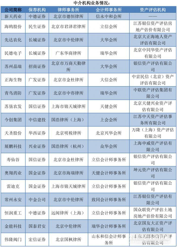 上述18家企业中,合计来自13家保荐机构,中德证券、长城证券、国信证券、国金证券和广发证券分别以两家上市公司过审的成绩夺得第一。
