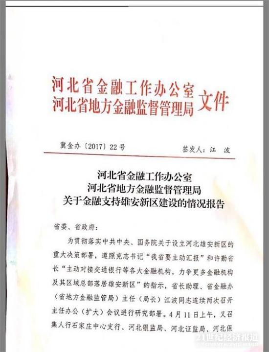 21世纪经济报道记者独家获悉的一份河北省金融工作办公室河北省地方金融监督管理局红头文件显示,为了力争更多金融机构以及区域总部落地雄安新区,河北省金融办主任江波连续召开会议研究部署。