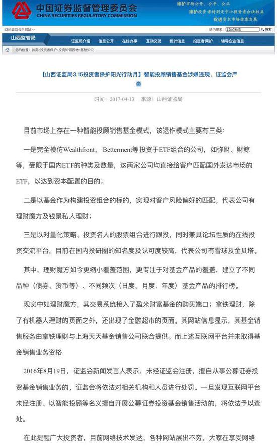 我们先看看证监会今天发布的这篇文章。(山西证监局3.15投资者保护阳光行动月)“智能投顾销售基金涉嫌违规,证监会严查!”