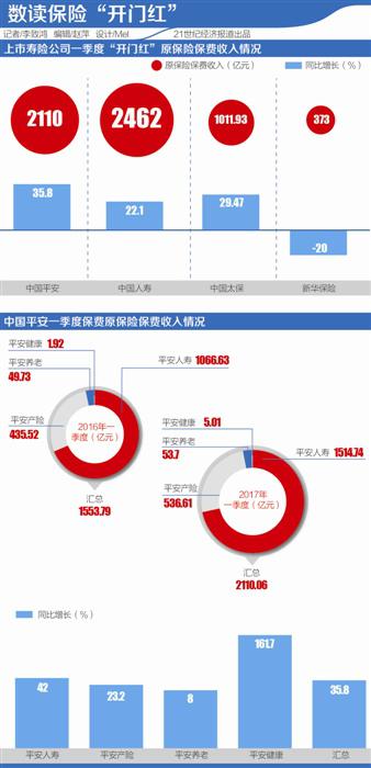 目前,上市保险公司正在陆续公布一季度业绩情况,包括中国平安一季度原保险保费收入2110亿元,同比增长近36%,寿险业务原保险保费收入大增逾8成;中国人寿原保险保费收入2462亿元,同比增长22.1%;新华保险原保险保费收入373亿元,同比下降20%;中国太保旗下寿险公司原保险保费收入749.20亿元,财险公司原保险保费收入262.73亿元。