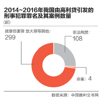 1℃记者检索中国裁判文书网发现,2014年~2016年,该网收录与高利贷相关的刑事判决共411例,所涉罪名涵盖了非法拘禁罪、故意伤害罪等多个罪名。非法拘禁罪成为由高利贷引发的数量最多的罪名之一,合计108例。