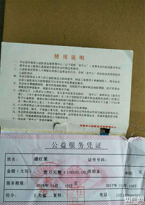 盛女士告诉记者,2006年以前的利息是每年每一万块钱有500元,到2016年利息下降为400元,她说叶县几乎每个村都有一个信贷员。盛女士向记者出示的凭据,是一张公益服务证,服务期限是一年,1万元钱的资助金是400元,盖有宋基保险的公章,“没有合同,就一个本,里边还有一张条。”