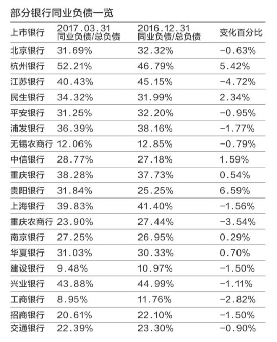 同业存单纳入进来后,哪些银行是否会超过1/3的红线?根据债金所对各上市银行2016年年报以及2017年一季度报告数据测算,若将同业存单纳入同业负债,有8家银行的同业负债/总负债突破红线。