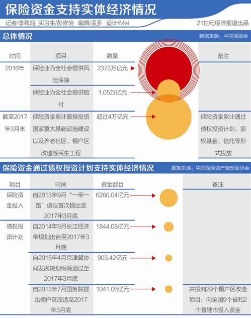 保监会披露的数据显示,2016年,保险业为全社会提供风险保障2373万亿元,赔付1.05万亿元。截至2017年3月末,保险资金累计通过债权投资计划、股权基金、信托等形式,直接投资国家重大基础设施建设以及养老社区、棚户区改造等民生工程,累计金额超过4万亿元。
