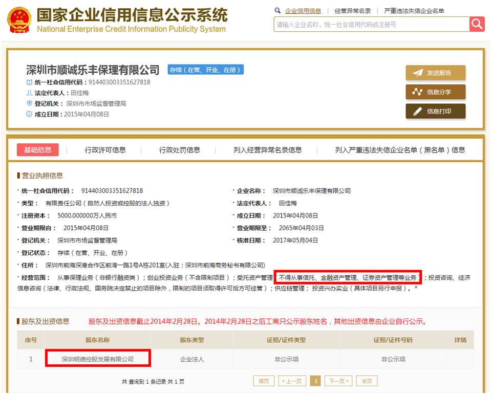 中国基金报记者从国家企业信息公示系统查询到:深圳市顺诚乐丰保理有限公司成立于2015年4月,注册资本金为5000万。