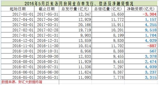 来自财汇大数据终端的最新统计数据显示,2017年5月份商业银行同业存单合计发行12347亿元,总偿还规模15650亿元。由此,5月同业存单净融资达到-3304亿元,创出了有史以来的单月最低纪录。而在此之前,同业存单单月净融资规模的最低水平,则为2016年11月时的-887亿元。