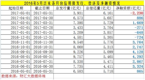 与此同时,受市场 资金利率持续高企、信用债发行融资成本居高不下等因素影响,2017年5月份信用债一级市场的净融资水平也同步迎来近年来罕见的低潮。当月全市场-2230亿元的信用债净融资额,也刷新了至少自2000年以来的单月最低水平。