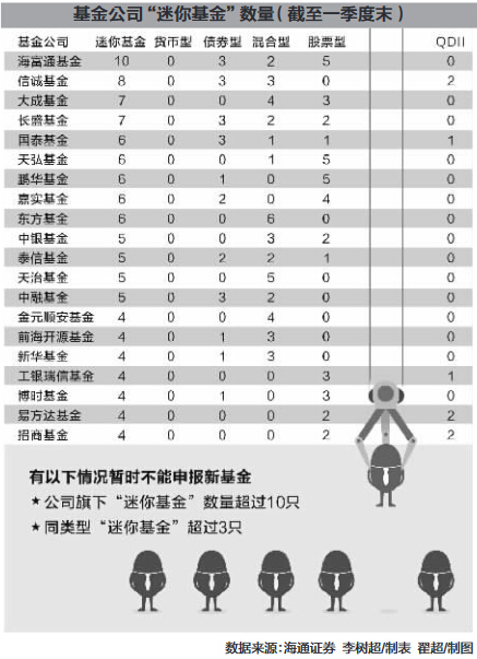 事实上,从各家公司“迷你基金”数量来看,目前触及10只红线的仅有1家,而同类型产品超过3只的就为数较多。数据显示,截至一季度末,海富通基金公司“迷你基金”数量达到10只,信诚基金、大成基金、长盛基金等8家公司的“迷你基金”数量在6~8只之间。
