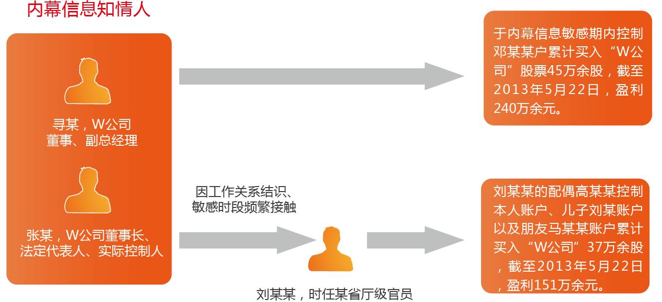 上市公司董事、副总经理寻某为上述系列利好事项的主办人,其控制“邓某”账户,于2013年2月累计买入W股票45万余股,交易金额330万余元,以复牌后首日打开涨停交易日收盘价计算,盈利240万余元。