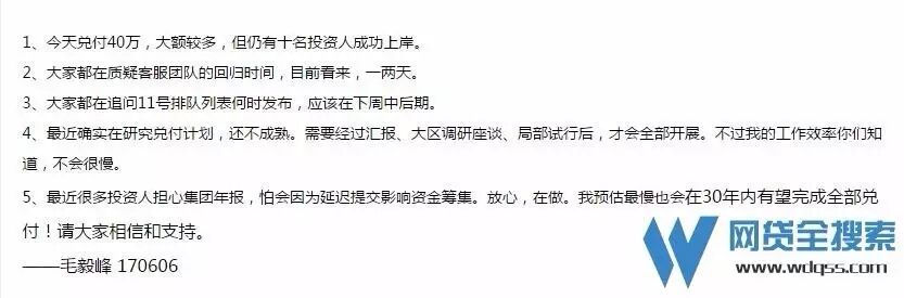 尽管30年的“龟速”还款计划令不少投资者“吐血”,但至少还有盼头。但到了6月15日,就有投资人在某论坛爆料,毛毅峰已经辞职。据该人士透露,之前毛毅峰就表示要淡出投资人视线了,“说好的30年兑付呢,你却偷偷的溜了”。