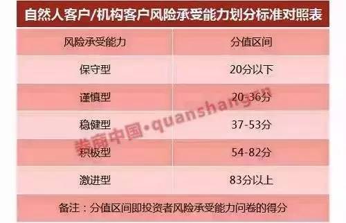 通过适用于个人投资者的“风险承受能力问卷”调查,考察财务状况、投资知识、投资经验、投资目标、风险偏好、年龄学历等内容。问卷得分低于20分,则会被划为保守型投资者。