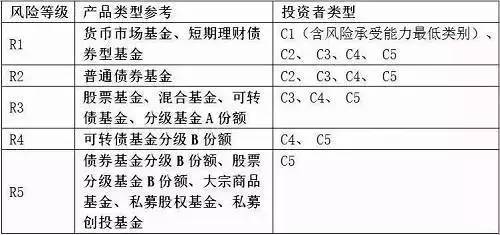 协会制定的风险等级名录,按照基金产品的风险等级由低到高,划分了R1、 R2、 R3、 R4、R5 五个等级。同时,《指引》将投资者也分为五个等级,按照风险承受能力,将普通投资者由低到高至少分为C1(含风险承受能力最低类别)、 C2、 C3、C4、 C5 五种类型。