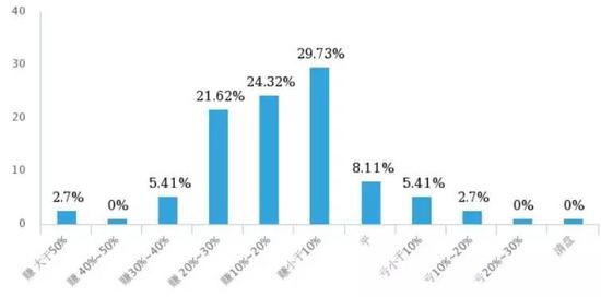不过由于此次调研样本相对较小,结果明显好于这一结果。记者调研的私募收益情况来看,83.78%的私募实现正收益,就具体投资回报率来看,小于10%的私募居多,占29.73%,10%到20%的占比紧随其后,达24.32%;有8.11%的私募出现亏损,亏损小于10%的私募占比为5.41%。