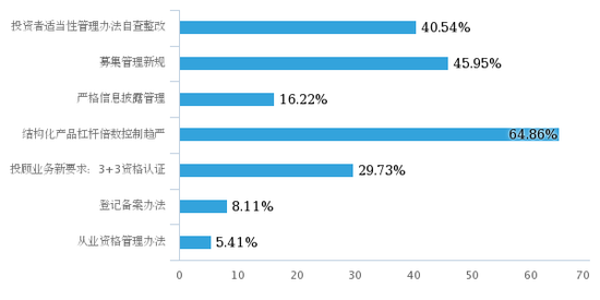 券商中国记者调查结果显示,在政策影响方面,64.86%的私募认为“结构化产品杠杆倍数趋严”对其影响最大,“募集管理新规”和“投资者适当性管理办法自查整改”是其他两项影响行业较大的政策。