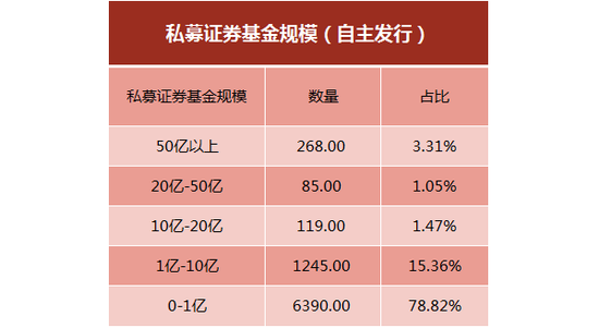 私募证券基金(自主发行)按照规模分布看,不到10亿的占据了超过9成,其中,1亿以下的私募占比为78.82%,1亿~10亿的私募占比为15.36%;10亿以上规模的私募占比为5.83%,50亿以上仅有3.31%。