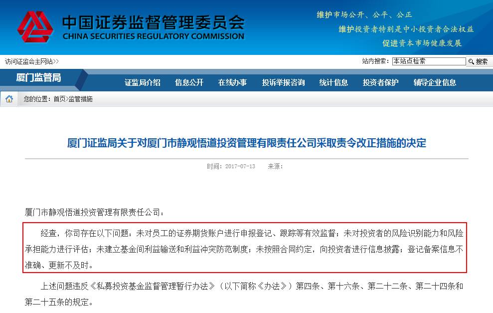 厦门证监局列举了厦门睿誉资产、厦门坤易投资、厦门市静观悟道投资、厦门鼎祥股权投资、厦门德宏嘉富股权投资等5家私募存在的问题,基金君归纳了一下,主要有几点: