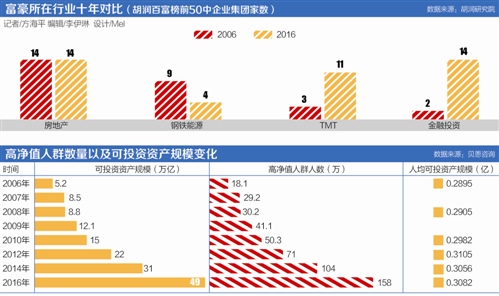 值得注意的是,10年来,房地产领域一直都是富豪人群的“高产区”。记者发现,在2006年与2016年的《胡润百富榜》报告排名前50中,涉及房地产行业的均有14家。