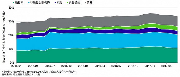 数据显示,随着非银行金融机构融资占比下降,各类批发融资在所有资金来源中的占比继2017年1月达到36.1%的最高水平之后,6月份降至33.8%。