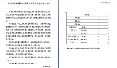 两地均要求私募填写诚信合规经营倡议书并回复至指定邮箱,以北京为例,回执表要求填写私募机构的部分基本信息,包括注册地、办公地、法定代表人和日常联系人信息。