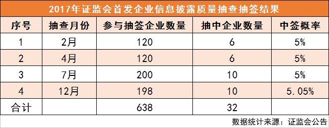 据证监会官网公告,2017年中国证券业协会分别于2月、4月、7月、12月组织4次首发企业信息披露质量抽查,合计32家企业。