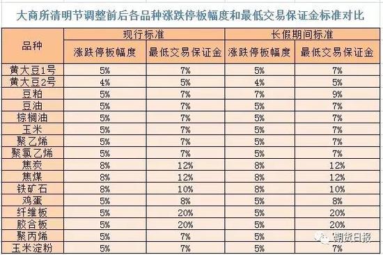 自2018年4月3日(星期二)结算时起,将豆粕品种涨跌停板幅度和最低交易保证金标准分别调整至7%和9%;黄大豆1号、黄大豆2号、豆油、棕榈油、玉米、玉米淀粉、铁矿石、焦煤、焦炭、聚乙烯、聚氯乙烯、聚丙烯、鸡蛋、胶合板和纤维板品种涨跌停板幅度和最低交易保证金标准维持不变。
