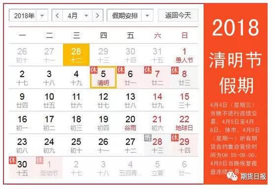 4月4日(星期三)当晚不进行连续交易。4月5日至4月8日,休市。4月9日(星期一)所有期货合约集合竞价时间为08:55-09:00。4月9日当晚恢复夜盘连续交易。