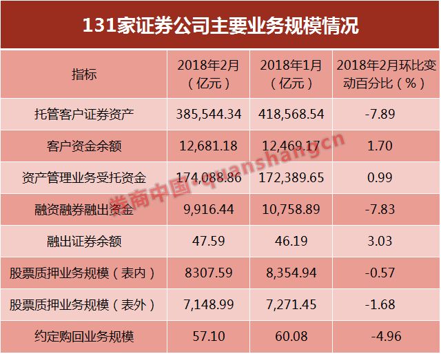 2月份受股票市场下跌影响,经纪业务客户市值环比缩水7.89%,融出资金下滑7.83%,是自2017年初以来单月最大降幅。