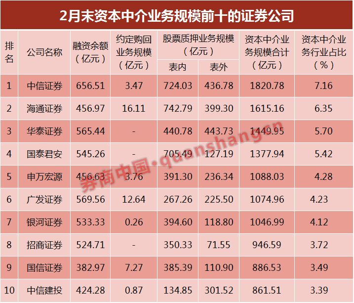 与此同时,国信证券和中信建投证券今年2月份的资本中介业务规模排名也发生了对调。国信证券排名上升一位,位居行业第九名,今年2月末资本中介业务规模合计886.53亿元,资本中介业务行业占比3.49%。中信建投证券排名下降一位,位居行业第十名,今年2月末资本中介业务规模合计861.51亿元,资本中介业务行业占比3.39%。
