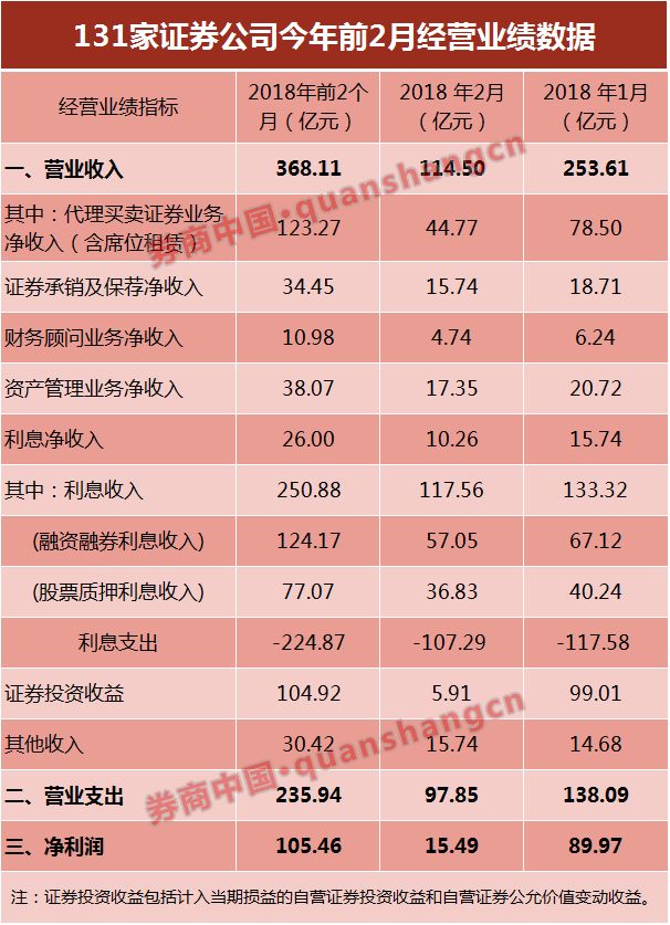 1.今年前2个月,131家券商合计实现营业收入368.11亿元,较上年同期增长1.8%;百家券商净利润总额达105.46亿元,较去年前两个月减少了9.25亿元,同比下滑8%。