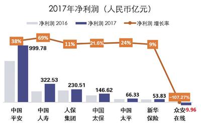 根据业绩报告统计:截至2017年底,7家上市保险公司净利润总计1810亿元。其中,中国平安的净利润最高达999.78亿元,众安在线是惟一一家净利润为负的公司,为-9.96亿元。上市保险公司净利润大增的“功臣”是表现不俗的投资收益。