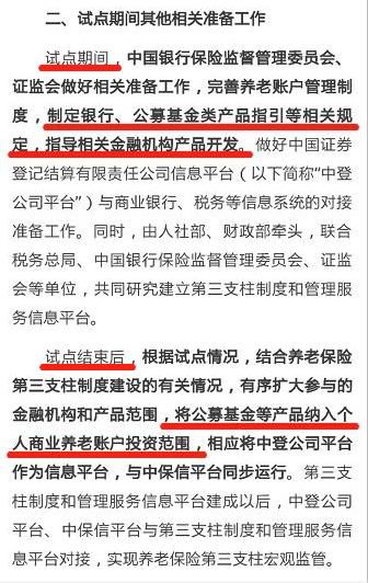 保险产品先期开展一年试点,“试点结束后……将公募基金等产品纳入个人商业养老账户投资范围,相应将中登公司平台作为信息平台,与中保信平台同步运行。”