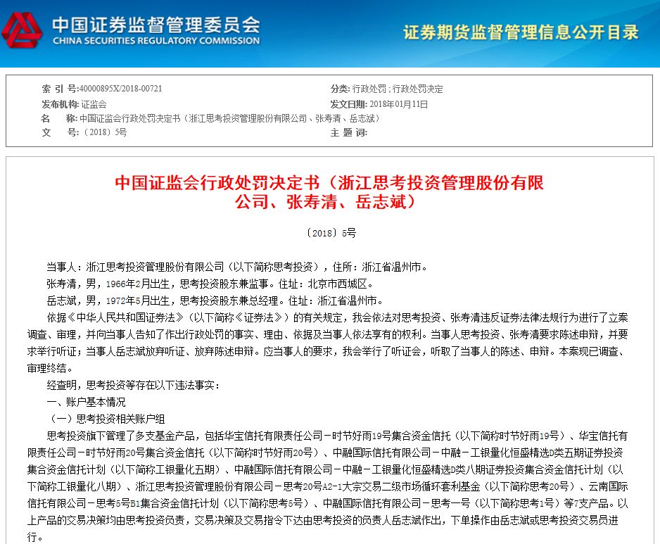 证监会表示,此次违法违规行为涉及思考投资旗下管理的7支基金产品,其交易决策及交易指令下达由思考投资的负责人岳志斌作出。另外,张寿清管理了西藏信托有限公司-致知1号、配偶“李某立”账户、“陈某阳”账户等3个账户。